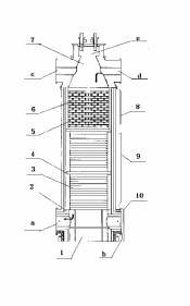 頂部進(jìn)氣的炭黑高溫裂解爐,立式爐體自上而下包括換熱蓄熱段(8)、蓄熱裂解段(9)和支撐匯集段(10),爐體上頂部內(nèi)有頂錐腔(7),頂錐腔(7)對應(yīng)爐體外連接防爆管口(c)和天然氣進(jìn)口和沖刷管口(d),頂錐腔(7)頂部安裝噴燃器接管口(e),天然氣進(jìn)口布置在爐體頂部,除操作維護(hù)方便之外,使蓄熱爐上部蓄熱磚成為爐體的高溫區(qū),而頂部進(jìn)入的裂解天然氣是低溫,在此段使天然氣快速預(yù)熱,這種布置方式可使天然氣裂解時(shí)溫度變化很窄,并可適當(dāng)提高蓄熱溫度,從而使蓄熱一裂解轉(zhuǎn)換周期更長,處理天然氣量更大,生產(chǎn)能力得到提高,以保證產(chǎn)品質(zhì)量穩(wěn)定,品質(zhì)提升。