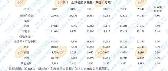 Notch咨詢(xún)公司預(yù)測(cè),受COVID-19新冠疫情 的影響,2020年橡膠消費(fèi)量將下降近10%至2610 萬(wàn)噸。 下降的原因既有輪胎廠和工業(yè)橡膠制品廠 的直接關(guān)閉,也有因擴(kuò)大社交距離而產(chǎn)生的影響, 如對(duì)新車(chē)銷(xiāo)量和行駛里程的影響。但,2020年下 半年,尤其是第四季度的情況有所好轉(zhuǎn),減緩了下 降速度。Notch預(yù)測(cè),全球需求將在2021年恢復(fù)到 COVID之前的水平,長(zhǎng)遠(yuǎn)來(lái)看增長(zhǎng)情況還是較好 的。預(yù)計(jì)橡膠消費(fèi)量將從2019年起以每年3.5%的 速度增長(zhǎng),到2024年將達(dá)到3430萬(wàn)噸。輪胎市場(chǎng) 將推動(dòng)這一增長(zhǎng)。
