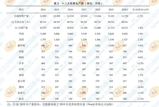 生產(chǎn):2019年全球炭黑總產(chǎn)量為1310萬(wàn)噸, 較2018年的1320萬(wàn)噸略有下降。截止2019年,按 產(chǎn)量由大到小排序,全球12個(gè)炭黑生產(chǎn)大國(guó)依次 是中國(guó)、美國(guó)、俄羅斯、印度、韓國(guó)、日本、巴西、 泰國(guó)、意大利、德國(guó)、加拿大和埃及(見(jiàn)表2)。 2019年12個(gè)炭黑生產(chǎn)大國(guó)的產(chǎn)量占全球炭黑產(chǎn)量 的89%,基本上這一現(xiàn)象從2014年以來(lái)就維持至 今。據(jù)Notch咨詢(xún)公司預(yù)測(cè),2020年全球炭黑產(chǎn)量 下降幅度將超過(guò)10%,預(yù)計(jì)會(huì)降至1170萬(wàn)噸,12 個(gè)炭黑生產(chǎn)大國(guó)的產(chǎn)量都將下降。2014年至2019 年,中國(guó)炭黑產(chǎn)量以每年1.9%的速度遞增,這說(shuō) 明了在2017年和2018年的穩(wěn)步增長(zhǎng)后,2019年的 年產(chǎn)量稍微有所下降。2014年至2019年,俄羅斯 的年產(chǎn)量增長(zhǎng)最為強(qiáng)勁,該國(guó)的產(chǎn)量每年增長(zhǎng)5%,主要是因?yàn)槌隹趶?qiáng)勁。根據(jù)新增產(chǎn)能計(jì)算, 2014年至2019年,印度炭黑產(chǎn)量每年增長(zhǎng)2.9%。 在其他幾個(gè)生產(chǎn)大國(guó)中,日本、巴西、加拿大和埃 及的產(chǎn)量在2014年至2019年間出現(xiàn)下降。