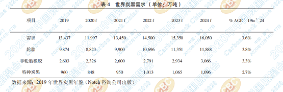 據(jù)預(yù)測(cè),從2019年到2024年,全球炭黑需求 將以每年3.6%的速度增長(zhǎng),到2024年將達(dá)到1610 萬(wàn)噸(見(jiàn)表4)。據(jù)Notch咨詢(xún)公司預(yù)測(cè),受COVID-19 新冠病毒的影響,全球炭黑需求在2020年將下降 近11%至1200萬(wàn)噸。但是,今年下半年炭黑市場(chǎng) 似乎正在復(fù)蘇中,到第四季度,由于輪胎生產(chǎn)的剛性會(huì)導(dǎo)致某些炭黑市場(chǎng)供應(yīng)緊張。Notch公司預(yù) 計(jì),炭黑產(chǎn)量將在2021年恢復(fù)到COVID之前的水 平。從長(zhǎng)遠(yuǎn)來(lái)看,2019年至2024年期間,全球宣 布對(duì)輪胎產(chǎn)能進(jìn)行211億美元的新投資,將推動(dòng)炭 黑需求。雖然COVID-19導(dǎo)致許多項(xiàng)目延期,但隨 著擴(kuò)建項(xiàng)目的恢復(fù),炭黑市場(chǎng)的長(zhǎng)期前景依然看好。