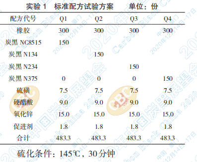 實驗 1 以橡膠標準配方作為依據,通過對比 NC8515、N134、N234、N375炭黑及其混煉膠的拉 伸強度、拉斷伸長率、100%定伸應力、300%定伸 應力和 DIN 磨耗數(shù)據,分析對比 NC8515 炭黑與 N134、N234及N375炭黑對橡膠性能的影響,來評 價 NC8515 炭黑的優(yōu)缺點;實驗 2 采用半鋼子午線 輪胎工業(yè)配方,在實驗室進行小配合實驗,研究 NC8515 炭黑應用于胎面膠配方中性能。