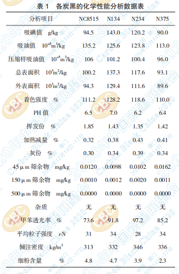 按照炭黑的分析方法對表征炭黑性能的幾個 指標進行了分析,分析結果如表 1.