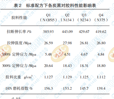 研究輪胎標準配方中各炭黑對膠料性能的影 響,我們分析了膠料的拉伸強度、扯斷伸長率、 100% 定伸應力、300% 定伸應力、膠料比重、DIN 磨耗指數(shù),其分析結果如表 2.
