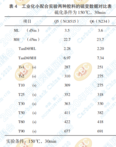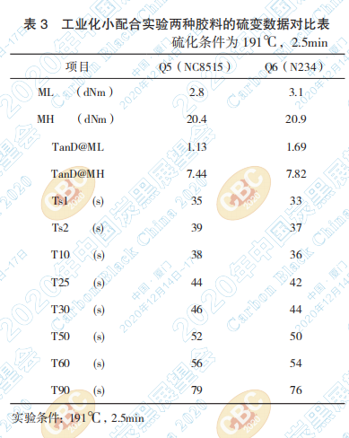 小結:從表3和表4可以看出,硫變性能中ML、 MH兩種炭黑沒有明顯差異,硫化時間方面兩種炭 黑相差不大,表征正硫化時間的T90雖有差異,但 差異在可以接受的范圍內。
