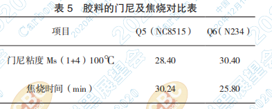 3.3.2 研究兩種炭黑補強的膠料門尼及焦燒,其 數(shù)據列于表5