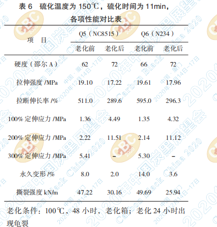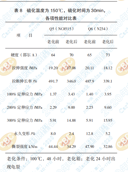 小結:由上表可以看出,在硫化溫度為150℃, 硫化時間為30min時,分析兩種炭黑填充的硫化膠 老化前后性能,膠料的硬度老化后具有上升趨勢, 拉伸強度老化后比老化前略有下降,同時 NC8515 炭黑填充的硫化膠拉伸強度與N234炭黑填充的硫 化膠拉伸強度老化前后均低約 1.0Mpa,伸長率兩 種膠料差異不明顯,但兩種炭黑填充的膠料老化 后伸長率比老化前均有明顯下降,定伸應力兩種 膠料無明顯差距,永久變形方面,用 NC8515 炭黑 填充的膠料明顯低于用 N234 炭黑填充的膠料,主 要原因應該是NC8515炭黑的高結構所致,撕裂強 度方面兩種硫化膠無明顯差異。
