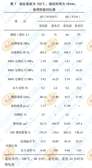 3.3.3 研究在硫化溫度為 150℃條件下硫化不同 時間,兩種不同炭黑的小配合實驗,膠料的各項 物理性能對比如表6、表7、表8。