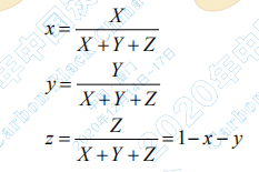 在 CIE 1931 標(biāo)準(zhǔn)色度系統(tǒng)中(2°視角),由 X、Y、Z 三刺激值可以計(jì)算出色品坐標(biāo) x、y、z: