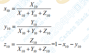 在 CIE 1964 標(biāo)準(zhǔn)色度系統(tǒng)中(10°視角),由 X10、Y10、Z10三刺激值可以計(jì)算出色品坐標(biāo)x10、 y10、z10: