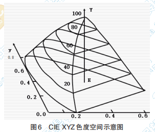 CIE 1931 XYZ標(biāo)準(zhǔn)色度系統(tǒng)的三刺激值以X、 Y、Z 表示,三種原色中只有 Y 值既代表色度又代 表亮度(又稱“明度”、“黑度”),稱為亮度因 數(shù),其取值范圍為0~100,而X、Z與亮度無關(guān),只 表示顏色的色度特征。這樣,一種顏色就能唯一 地由 X、Y、Z 一組數(shù)確定下來,如圖 6。