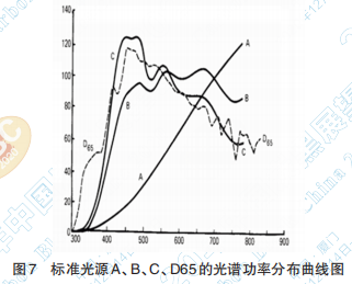 不同光源有不同的光譜功率分布,每一光源 的光譜功率分布決定了光譜功率分布,常見的標(biāo) 準(zhǔn)光源 A、B、C、D65 的光譜功率分布曲線如圖 7 所示。
