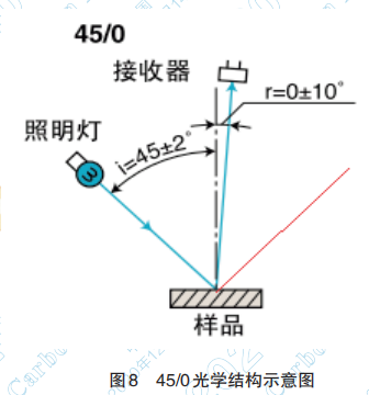 45/0光學(xué)結(jié)構(gòu)指,光源光(照明燈)從與法線 成約45°的角度照射到樣品表面,再以與法線成約 0°的角度漫反射到儀器接收器。因此,接收器接 收到的樣品反射光信號(hào)不是普通意義上“入射角 等于反射角”的反射光信號(hào),而是漫反射光信號(hào), 如圖 8 所示。5/0 光學(xué)結(jié)構(gòu)更符合人眼對(duì)樣品顏色 觀測(cè)的習(xí)慣。