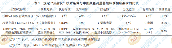對(duì)照 GB/T 3977、GB/T 3978、GB/T 3979 等中 國(guó)顏色測(cè)量基礎(chǔ)標(biāo)準(zhǔn),分析埃里克森著色試驗(yàn)儀 527與FHD-1型反射式黑度儀的產(chǎn)品使用說明書, 可以整理出表 1: