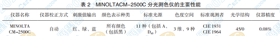 選擇的分光測(cè)色儀為同樣采用 45/0 光學(xué)結(jié)構(gòu) 的日本美能達(dá)公司產(chǎn)品 MINOLTA CM-2500C,其 主要技術(shù)性能如表 2 所示: