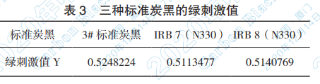 按照《色素炭黑 黑度的測(cè)定》(GB/T 7048- 2012)規(guī)定的方法制待測(cè)炭黑樣品的墨膜,采用 45/0 光學(xué)結(jié)構(gòu)、D65 標(biāo)準(zhǔn)光源、CIE1931 標(biāo)準(zhǔn)觀測(cè) 者模式測(cè)色,測(cè)得 3# 標(biāo)準(zhǔn)炭黑、IRB 7(N330)、 IRB 8(N330)三種標(biāo)準(zhǔn)炭黑的綠刺激值 Y 如表 3 所示: