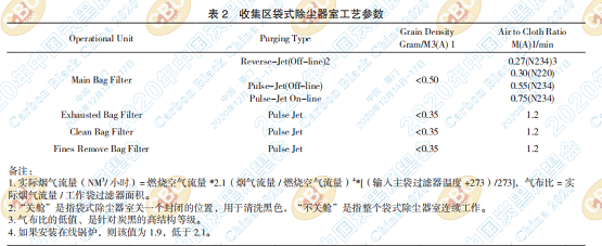 b、袋濾器室的工藝參數(shù)為粉狀炭黑密度和氣 布比,見表 2: