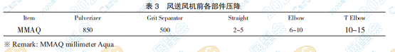 c、風(fēng)源管線的工藝參數(shù)為載氣流速和風(fēng)機(jī)靜 壓。管道設(shè)計正常流速約 30m/s,但是,避免粉體 炭黑堵塞,氣動管線流速必須大于 45m/s,風(fēng)機(jī)前 各部件壓降見表 3。