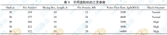 造粒機(jī)的處理能力是由操作經(jīng)驗所獲得的 值,該值由造粒水量來確定,該水量與炭黑的反應(yīng) 器產(chǎn)出量和粉狀炭黑回收回流量呈正相關(guān),可由 炭黑在纜索狀態(tài)下的含水率來轉(zhuǎn)換測算。同時與 該設(shè)備的工藝參數(shù)與殼體直徑、長度和軸承的攪 齒有關(guān),如表 4 所示。