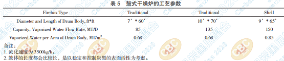 鼓式干燥機(jī)的工藝參數(shù)也是根據(jù)操作數(shù)據(jù)得 出的經(jīng)驗值,包括不同直徑的鼓式干燥爐的單日 蒸發(fā)水量以及整個鼓式干燥機(jī)本體的單位面積鐵 皮蒸發(fā)水量。鼓式干燥機(jī)的工藝參數(shù)與處理量的 關(guān)系,如表5所示,而炭黑的產(chǎn)量也可以由其結(jié)構(gòu) 的含水率來轉(zhuǎn)換測算。