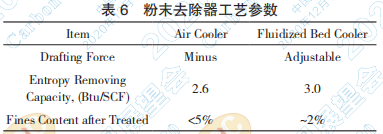 該區(qū)與工藝設(shè)計有關(guān)的設(shè)備應(yīng)只有風(fēng)冷器, 目前已知有的是空冷器和流化床冷卻器兩種。如 果生產(chǎn)線產(chǎn)量大或廠址在炎熱氣候區(qū),炭黑出口 溫度高,在炭黑進(jìn)入料倉前就必須安裝冷卻器。流 化床冷卻器在除粉、降溫方面優(yōu)于風(fēng)冷器,但是,流化床冷卻器在國內(nèi)黑線生產(chǎn)中尚屬少見。相關(guān) 工藝參數(shù)如下表 6 所示。