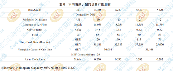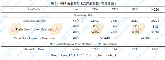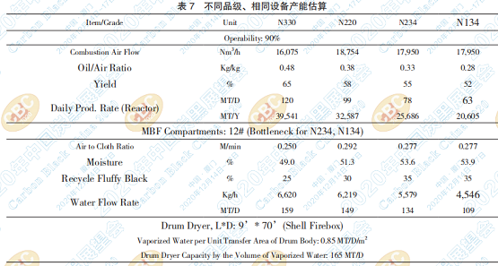 鼓式干燥爐由于工作時間和空間是最難去瓶 頸的,因此,是生產(chǎn)線設(shè)計和測算最大生產(chǎn)能力的 標(biāo)準(zhǔn)。在此基礎(chǔ)上可知上述計算,N134 生產(chǎn)裝置 的瓶頸設(shè)備是主袋袋濾器,總產(chǎn)量僅為 N330 的一 半(=52%),原因是 N134 油風(fēng)比低、收率低,相 關(guān)測算結(jié)果請參考表 7。