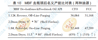 若主袋袋濾器變更為脈沖在線吹掃的形式, 配套目前已知最大產(chǎn)能的 11.5’*80’鼓式干燥爐 11.5’*80’(殼式火箱),產(chǎn)能在使用煤焦油與澄 清油后,分別提高了16,384噸和16,121噸。相關(guān)測 算結(jié)果如表9所示。同時與表7比對,使用煤焦油, 產(chǎn)能提高 45%,用澄清油則提高 31%,如表 10 所 示。
