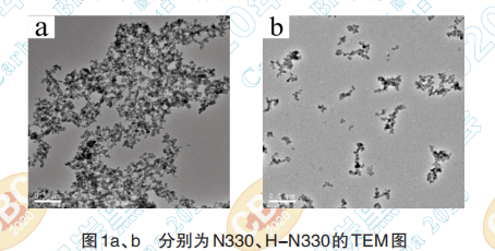 由圖1a 可見,N330 在水溶液中是以較大的聚 集體的形式存在,分散性差。經(jīng)過氧化改性后,如 圖1b,H-N330在水溶液中獲得了良好的分散。大 塊聚集體被氧化分解為小顆粒的聚結(jié)體。
