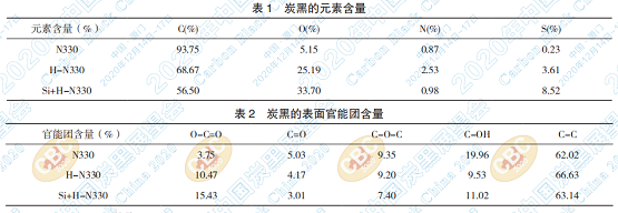 如表1、表2所示,XPS的檢測表明,未經(jīng)改性 處理的N330,含有一定量的羧基、羰基、內(nèi)酯基、 羥基等基團(tuán),主要以羥基為主,含氧量極低,表面 基本呈惰性。使用改進(jìn)的 Hummers 法處理之后, H-N330含氧量大幅增加,但由于Hummers法使用濃硫酸,也引進(jìn)了少量硫元素。這一過程中,炭黑 表面含氧官能團(tuán)的占比也相應(yīng)得以提升。因為強(qiáng) 酸氧化的關(guān)系,表面羧基含量超過了羥基。H-N330 經(jīng)Si69進(jìn)一步處理以后,O和S元素占比進(jìn)一步增 大。 因 為 接 枝 反 應(yīng) 消 耗 了 部 分 羥 基, 所 以 Si+H-N330 表面以羧基為主。