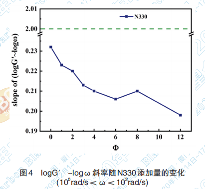 多組分高聚物動態(tài)流變學(xué)研究結(jié)果表明在低 頻區(qū),logG′ ~logω關(guān)系的斜率通常偏離了線性粘 彈理論的斜率2,偏離程度可以敏感反應(yīng)出多組分 體系的非均相程度,斜率越接近2,均相程度越高。 N330 的 logG ′ ~logω 曲 線 在 處 于 較 平 穩(wěn) 區(qū) 間 (100 rad/s < ω < 102 rad/s)的曲線斜率如圖 4,表明隨 N330 添加量的增加,分散變差。