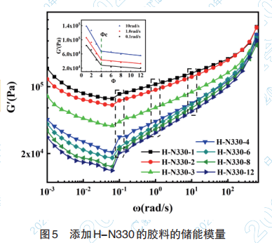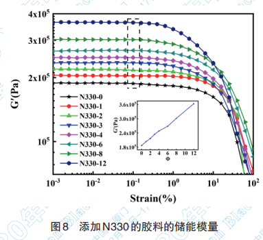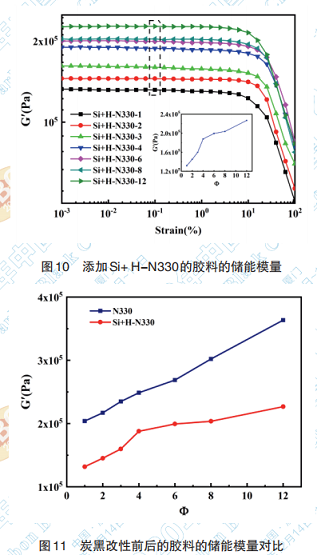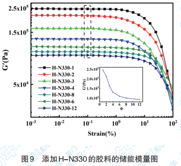 (3)在應(yīng)變掃描中,詳細(xì)的揭示了絮凝膠 Payne效應(yīng)的微觀機(jī)理,并以此來表征炭黑在絮凝 膠中的分散性。相較于N330,H-N330在絮凝膠中 的分散性得到大幅提升,但是因H-N330表面存在 大量親水基團(tuán),與橡膠基體相容性差。經(jīng)過Si69處 理以后,Si+H-N330 與橡膠分子鏈形成化學(xué)交聯(lián) 點,同時也獲得了良好的分散。總體結(jié)果與頻率 掃描得到的結(jié)論基本一致。