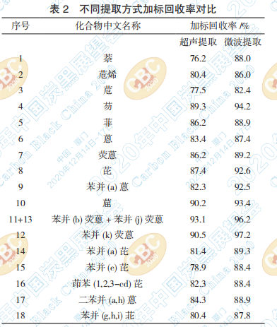 本文同時在炭黑樣品待提取液中添加濃度為 50ng/mL 的 PAHs 標(biāo)準工作溶液,分別使用微波法 和超聲法進行提取炭黑中的 PAHs,比較提取后兩 種試液中 18 種 PAHs 的加標(biāo)回收率,結(jié)果見表 2。