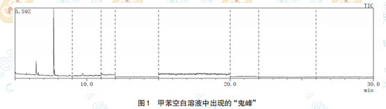 標(biāo)準中指出“使用聚四氟乙烯濾膜過濾后直接 進樣”。筆者建議,過濾前應(yīng)先將提取液經(jīng)1500r/min 高速離心機離心2 min。該步驟的離心過程相當(dāng)重 要,濾液的是否凈化直接影響到儀器的分析準確 性。純凈度稍低的樣液進樣后會導(dǎo)致襯管壁受到 污染,當(dāng)襯管里的污染物積累到一定程度時,會吸 附樣品造成峰拖尾/分裂或出現(xiàn)鬼峰,影響分析的 準確度,如圖 1 所示的“鬼峰”。