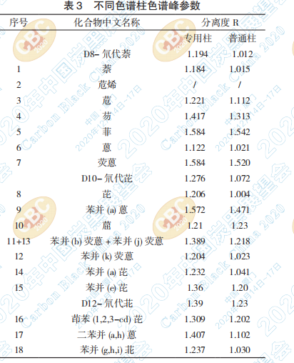標(biāo)準規(guī)定的定量方法是內(nèi)標(biāo)法。內(nèi)標(biāo)法最大 的優(yōu)點是定量結(jié)果與進樣量重復(fù)性無關(guān),可以有 效避免手動進樣體積的誤差而引起較大的誤差。 使用內(nèi)標(biāo)法需要注意的是,內(nèi)標(biāo)物需要和待測物 完全分離。一般來說,相鄰兩個峰其分離度R≥1.5 時,則說明兩個峰完全分離;當(dāng) R=1.0 時,說明兩 個峰剛好分離;當(dāng) R < 1.0 時,說明兩峰有部分重 疊[7]。若內(nèi)標(biāo)物與待測物分離效果不佳,就會對內(nèi) 標(biāo)物的峰面積計算產(chǎn)生一定的影響,進而影響了 分析的結(jié)果。標(biāo)準中規(guī)定可選用PAHs專用色譜柱 或者固定液化學(xué)組成相當(dāng)?shù)纳V柱。使用兩種色 譜柱,PAHs 的分離效果稍微有差別,其分離度見 下表 3。
