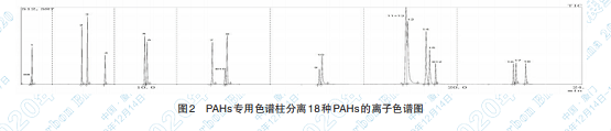 從表 3 的分離度 R 結(jié)果可以看出,選用 PAHs 專用色譜柱各相鄰物質(zhì)的分離度要比普通柱的分 離度稍高,分離效果較佳,因此定量更加準確。圖 2 是選用 PAHs 專用色譜柱分離 18 種 PAHs 的離子 色譜圖。
