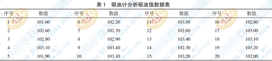 取 4 號標樣(吸油值范圍:101.4 ~ 103.8,中 值為 102.6)混勻后分成二十份,在同一作業(yè)環(huán)境 (同一個實驗室,同樣的溫度、濕度),分析數(shù)據(jù) 如下表(表 1):