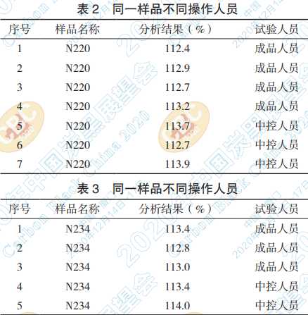 可安排不同的操作人員在同一臺儀器設備上 對同一個樣做對比實驗,舉N220和N234進行對比 實驗的例子如下表(表 2、表 3):