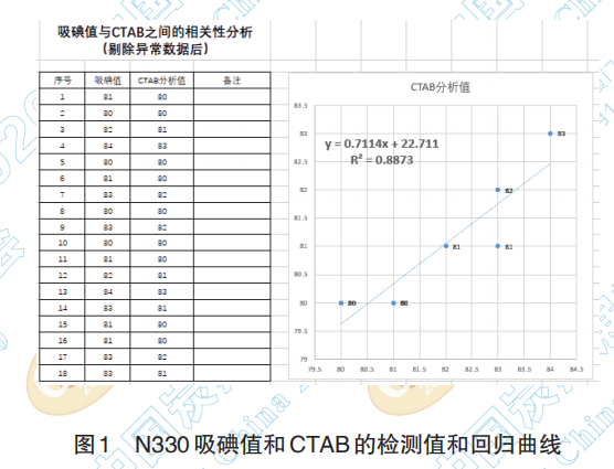 取某N330樣品混合均勻后分作18份進行吸碘值 和CTAB的測定,檢測值和回歸結(jié)果見下圖(圖1):