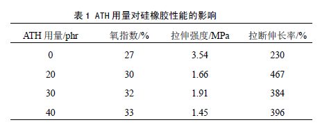 ⑴ 硅橡膠中添加30 份ATH 后,材料氧指數(shù)達到32%,拉伸性能及阻燃性能相對較好。