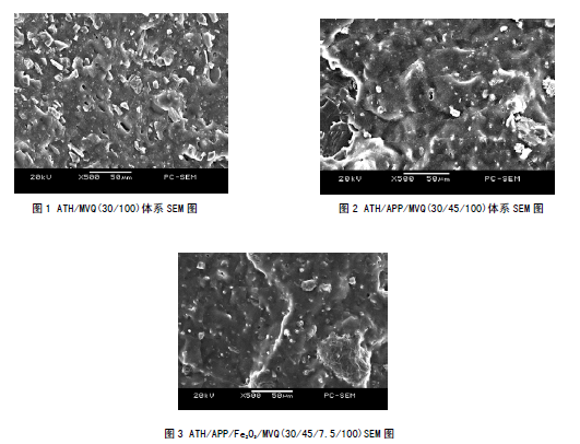 無鹵阻燃硅橡膠材料綜合性能受到阻燃劑在基體中的分散情況以及界面結(jié)合情況的影響。圖1為ATH/MVQ (30/100) 體系的斷面掃描電鏡圖(SEM);圖2 為ATH/APP/MVQ (30/45/100) 體系的SEM 圖;圖3 為ATH/APP/Fe2O3 /MVQ(30/45/7.5/100) 體系的SEM 圖。結(jié)合能譜分析以及SEM 圖觀察可知,ATH 顆粒為不規(guī)則粒狀,與基體界面間存在明顯間隙(圖1);APP 顆粒尺寸明顯大于ATH 顆粒,為表面多孔的團塊狀顆粒(圖2、圖3);Fe2O3 顆粒細小呈規(guī)則球狀,與ATH、APP 顆粒相間分布于基體中(圖3)。綜合圖1~圖3 看出,三種體系中的阻燃劑均不存在明顯團聚現(xiàn)象,分散情況較好,但阻燃劑與基體界面結(jié)合情況不佳,這也是導(dǎo)致三種阻燃硅橡膠體系力學(xué)性能大幅下降的主要原因。