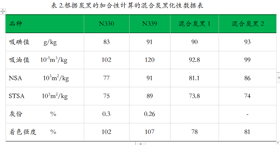 表2.根據(jù)炭黑的加合性計(jì)算的混合炭黑化性數(shù)據(jù)表