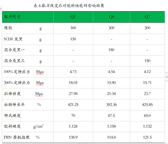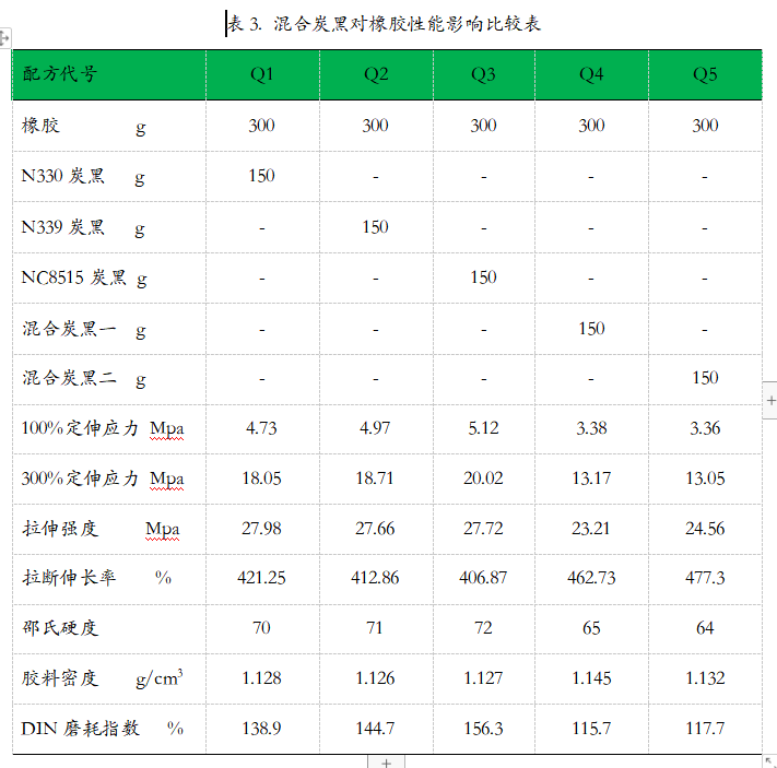 表3. 混合炭黑對(duì)橡膠性能影響比較表