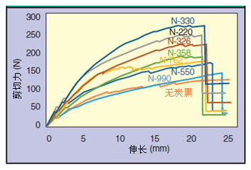 雖然不同品種炭黑的填充量是實(shí)現(xiàn)橡膠最終應(yīng)用所需改性程度的關(guān)鍵因素,但對(duì)于本研究中所有炭黑品種,則故意把這一填充量保持在20phr不變。炭黑填充量保持不變,旨在確保我們對(duì)聚合物-炭黑相互作用有所了解。對(duì)于該復(fù)合物中的不同炭黑,金屬表面上底漆的實(shí)測(cè)剪切力與拉伸關(guān)系曲線如圖1所示。