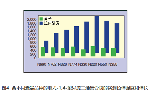圖1、圖2和圖3均表明,一次聚集體及包含其的球形粒子的性能是決定炭黑性能的重要因素。由更細(xì)的原生粒子炭黑賦予的高表面積需要更多的能量使其潤(rùn)濕和分散,且每單位重量的炭黑趨于“綁縛”更多的橡膠,導(dǎo)致膠料比含較粗粒炭黑的膠料更硬。如圖4所示,硫化復(fù)合物的拉伸強(qiáng)度與復(fù)合物所含炭黑的DPBA吸收值具有良好的相關(guān)性。這里需要注意的是,在圖4中,炭黑表面積或聚集體結(jié)構(gòu)的變化影響了拉伸強(qiáng)度,但是隨著炭黑表面積的變化,伸長(zhǎng)率卻依然幾乎保持不變。我們用振動(dòng)光譜分析這兩種橡膠的結(jié)構(gòu)變化時(shí),將會(huì)討論這些差異。