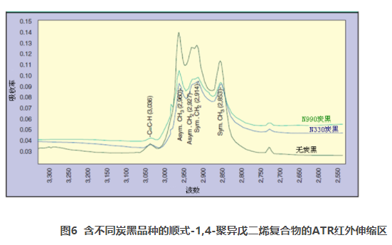 從圖6可明顯看出,對(duì)于CH伸縮區(qū)域,不含炭黑的聚合物與含N990的聚合物和含N330的聚合物存在本質(zhì)的強(qiáng)度差異。這些差異與炭黑和聚異戊二烯之間的相互作用有關(guān)。