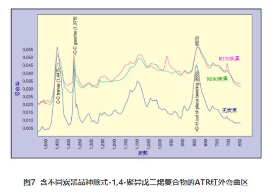 圖7中,當(dāng)順式-1,4-聚異戊二烯與N-330炭黑一起混煉時(shí),1447cm-1吸收帶的強(qiáng)度相對(duì)于1375cm -1有所提高,而當(dāng)這種合成橡膠與N990炭黑一起混煉時(shí),這一比率則略有下降。這兩個(gè)頻帶分別歸屬于可自由旋轉(zhuǎn)的C-C鍵的反式構(gòu)象和反式構(gòu)象的彎曲振動(dòng)。在這里,應(yīng)當(dāng)指出的是,本研究使用的其它炭黑的紅外光譜數(shù)據(jù)表明了類(lèi)似的行為模式。833cm -1處的譜帶歸屬給了順式-1,4-聚異戊二烯= CH非平面彎曲模式,以便用作參考峰對(duì)該聚合物的不同復(fù)合物的1400 -1區(qū)域強(qiáng)度進(jìn)行比較。我們注意到,隨著炭黑DBP吸收值的增加,計(jì)算出的光譜中1447cm-1譜帶與1375cm-1譜帶之比例會(huì)稍有增大。因而,炭黑與聚合物間的相互作用會(huì)導(dǎo)致優(yōu)選構(gòu)象的喪失,不難想象這是由于該聚合物形成了強(qiáng)吸收的表面層。