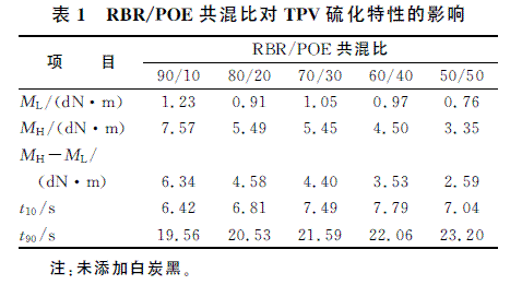 RBR/POE共混比對RBR/POE TPV 硫化特性的影響如表1所示。