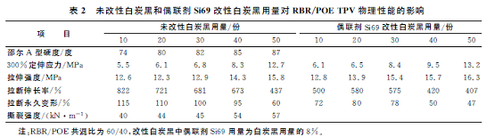 未改性及偶聯(lián)劑Si69改性白炭黑用量對RBR/POE TPV物理性能的影響如表2所示。