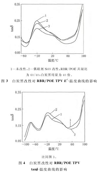 白炭黑改性對RBR/POE TPV的E′-溫度曲線和tanδ-溫度曲線的影響分別如圖3和4所示。