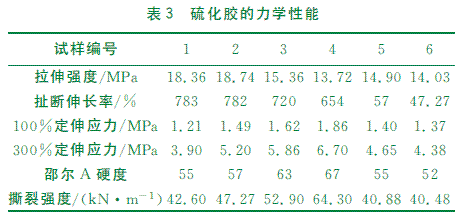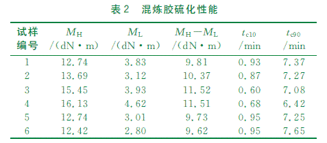Haake轉(zhuǎn)矩流變儀:RC90型,德國哈克公司;無轉(zhuǎn)子硫化儀:GT-M2000-A型,臺灣高鐵科技股份有限公司;平板硫化機:HS100T-RTMO-908型,佳鑫電子設備有限公司;開煉機:X(S)K-160,上海雙翼橡塑機械有限公司;邵氏A橡膠硬度計:上海險峰電影機械廠;拉力試驗機:AI-7000S型,臺灣高鐵科技股份有限公司;橡膠加工分析儀:RPA2000,美國ALPHTECHONOLOGIES公司;動態(tài)熱機械分析儀:DMA-242型,德國NETZSCH 公司;壓縮生熱試驗機:EKT-2000GF,臺灣曄中科技股份有限公司。