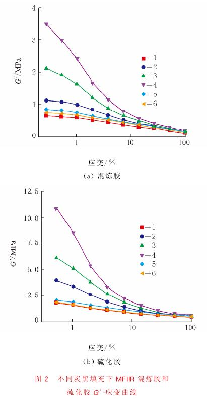 由圖2可以看出,不論是混煉膠還是硫化膠都出現(xiàn)明顯的Panye效應。Panye效應的強弱可以用儲能模量(G′)在低應變和高應變下的差值來表示,實質(zhì)就是炭黑-炭黑網(wǎng)絡結(jié)構(gòu)隨應變變化而被破壞的情況。
